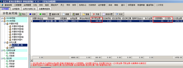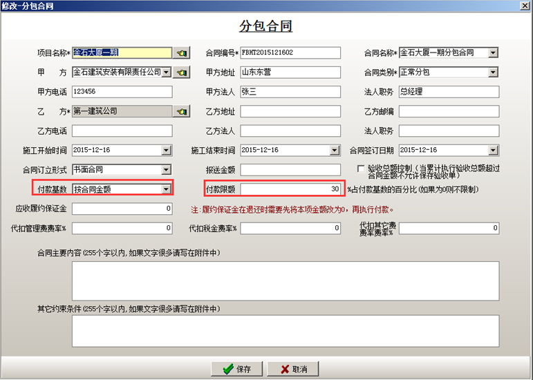 新建分包合同,在付款基數(shù)選擇“按合同金額”(統(tǒng)計(jì)成本是可按照合同金額統(tǒng)計(jì)成本),并輸入付款限額。如圖所示:
