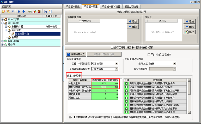 在“工程管理”-“項(xiàng)目維護(hù)”中進(jìn)行“項(xiàng)目預(yù)算”的設(shè)置。如圖所示: