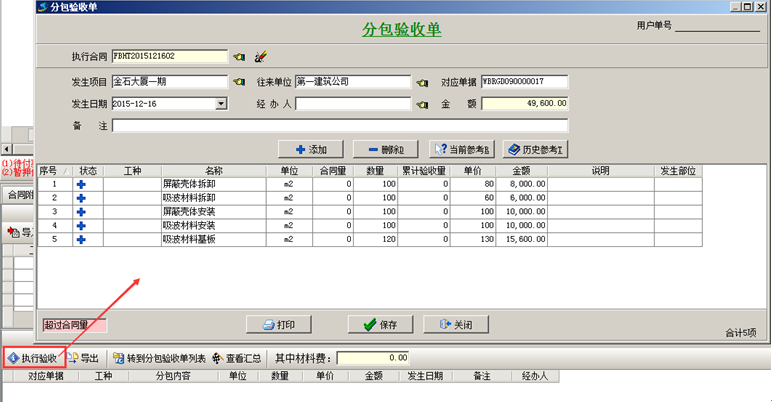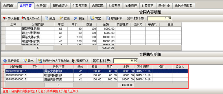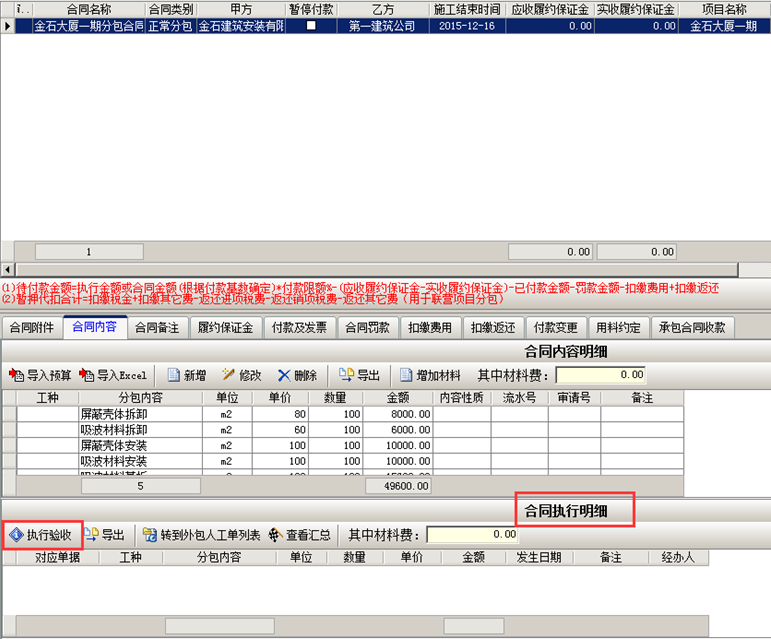 驗(yàn)收完成,系統(tǒng)生成合同執(zhí)行明細(xì),如下圖所示: