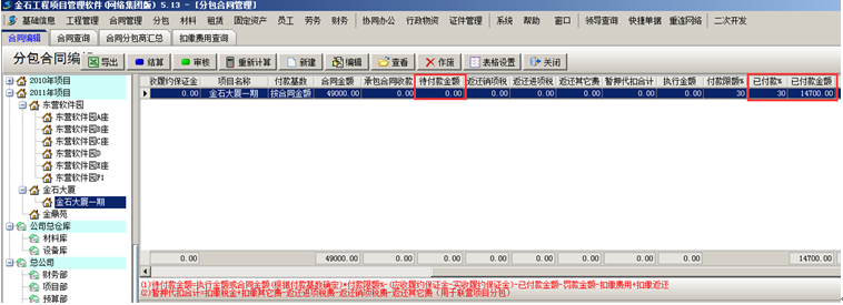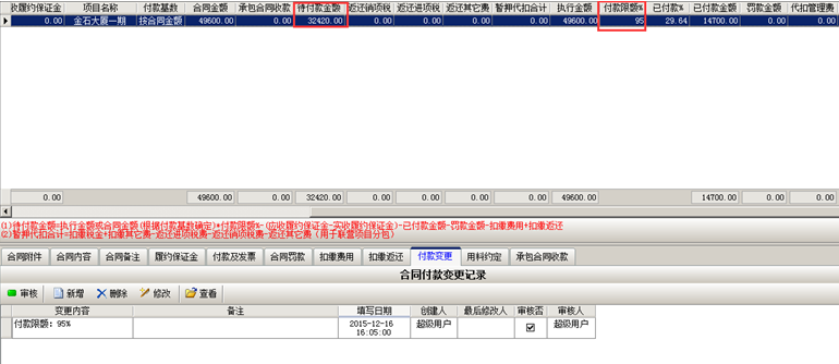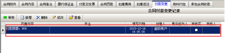 一般合同驗(yàn)收完成之后,按照合同條款支付到95%,此時(shí)添加“付款變更單”,如圖所示: