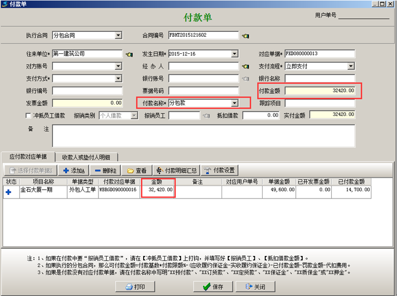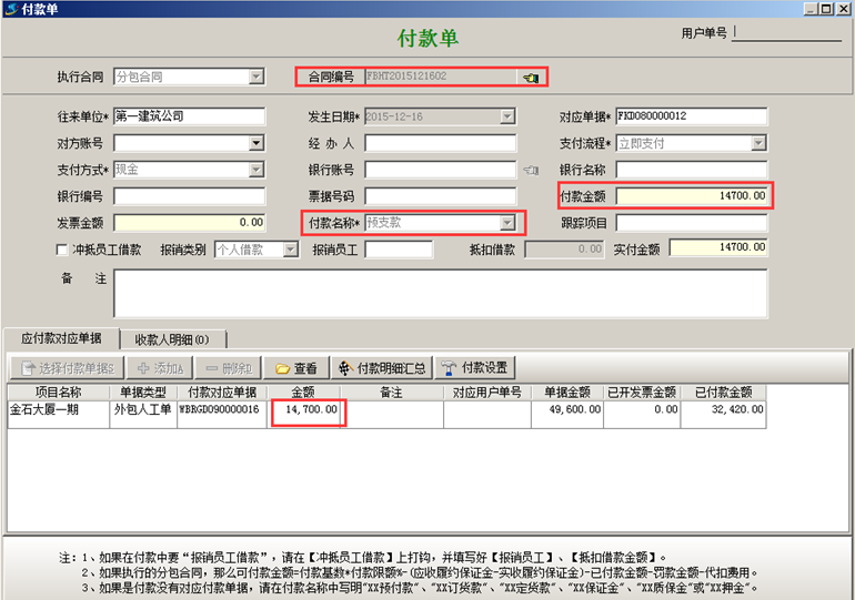 添加“付款單”,付款名稱為“預(yù)付款”、對(duì)應(yīng)好合同編號(hào)、輸入付款金額,如圖所示: