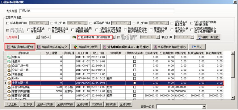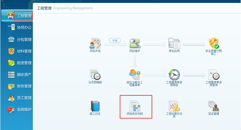 在“工程管理”-“項(xiàng)目成本利潤”中進(jìn)行項(xiàng)目成本利潤的查詢。如圖: