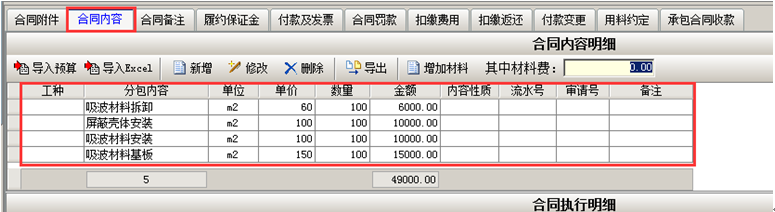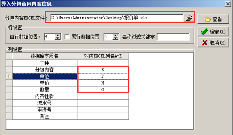 內(nèi)容與各列名對(duì)應(yīng)好之后點(diǎn)擊確定合同內(nèi)容導(dǎo)入系統(tǒng)中。注:導(dǎo)入的分包內(nèi)容要連續(xù),如果有分段分組現(xiàn)象,要先手工刪除,再執(zhí)行導(dǎo)入!
