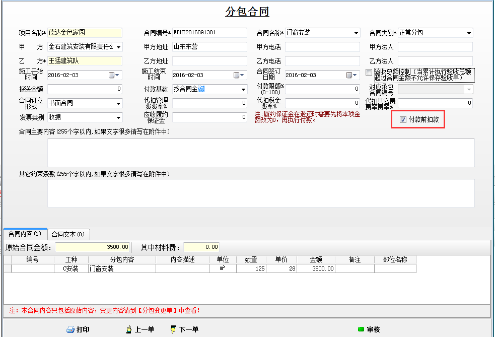 如果分包合同付款時,沒有做扣款,則軟件提示