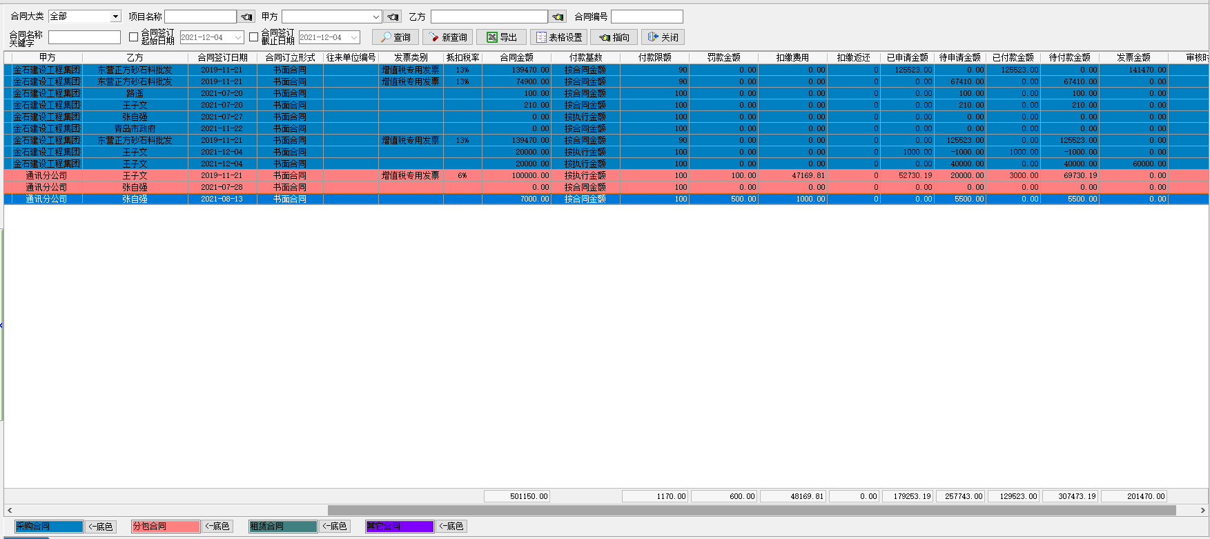 查詢內(nèi)容包括:合同基礎(chǔ)信息(時(shí)間、甲乙方)、發(fā)票信息(類別、稅率)、金錢往來(付款、罰款、扣繳、已付款、未付款等信息)