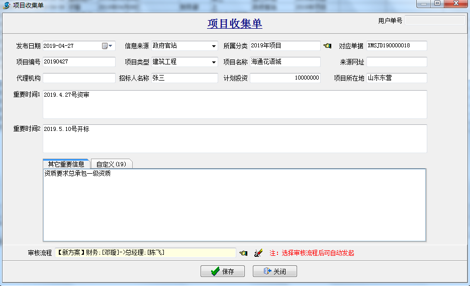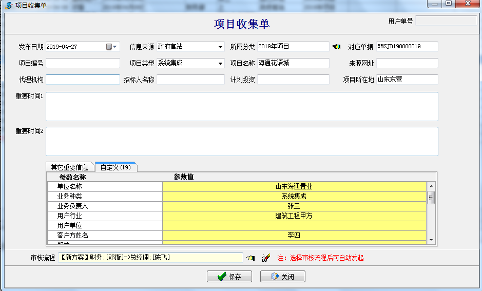 項目收集單:主要是用于項目投標(biāo)前的收集,公司銷售人員將在“政府網(wǎng)站” 、“自己開拓”等項目前期信息歸檔并走相應(yīng)的公司內(nèi)審批流程,確定哪些項目我們可以去參與投標(biāo)。