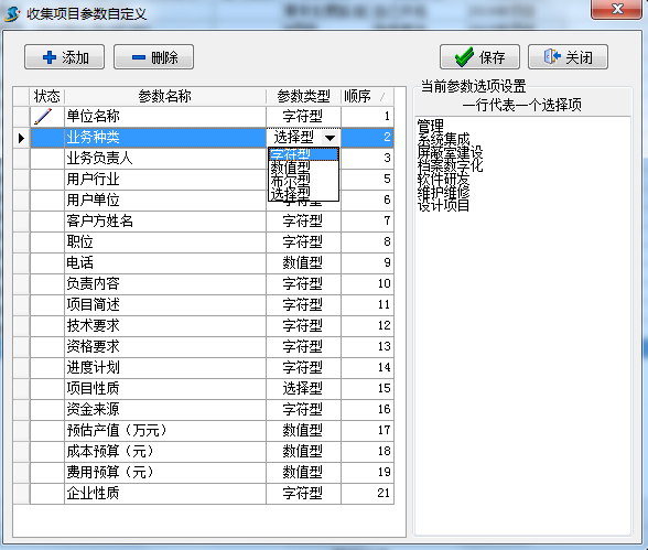①點“添加”按鍵增加豎列; ②在“參數(shù)名稱”列輸入需要的內(nèi)容; ③“參數(shù)類型”列選擇類型,其中“字符型”可輸入文字和數(shù)值、 “選擇型”可以如下圖中顯示一行代表一個選擇項,只可選擇不能輸入 、“數(shù)值型”只能輸入數(shù)值,不能輸入文字內(nèi)容 、 “布爾型”則是勾選選擇型; ④“順序”列調(diào)整自定義項的先后排序 。