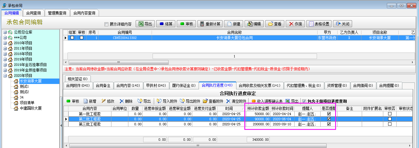 1、在【工程管理】-【承包合同】-合同執(zhí)行進(jìn)度,點(diǎn)擊新增,填寫(xiě)預(yù)計(jì)收款金額、預(yù)計(jì)收款時(shí)間、提醒人、是否提醒。