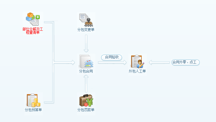 工程項目分包管理,可用于統(tǒng)計專業(yè)分包產(chǎn)生的成本及臨時雇用的零工成本。如軟件流程圖所示:分包成本是由外包人工單產(chǎn)成,其來源可分為兩部分,第一:來自分包合同中的合同驗收,第二:來自合同外零、點工驗收。