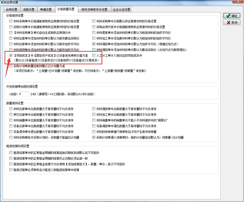 在工程項目管理軟件【系統維護】-【系統全局設置】-【價格數量設置中】有設備計算成本方式的控制開關,如下圖: