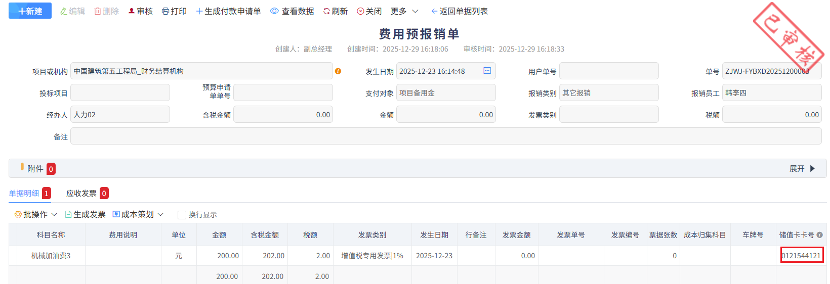 審核完成后,后續(xù)做儲值卡充值時可以關(guān)聯(lián)該單據(jù)。