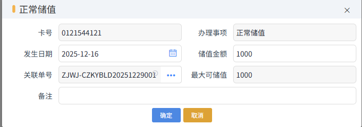 點擊添加,卡號,用途,建卡的方式,以及授權(quán)用戶,最后點擊確定完成建卡。只有審核完成后,才能進行儲值的動作,添加下方的正常儲值,就可以輸入本次充值的金額,關(guān)聯(lián)單號里選擇關(guān)聯(lián)的儲值卡預(yù)辦理單,如下圖所示,
