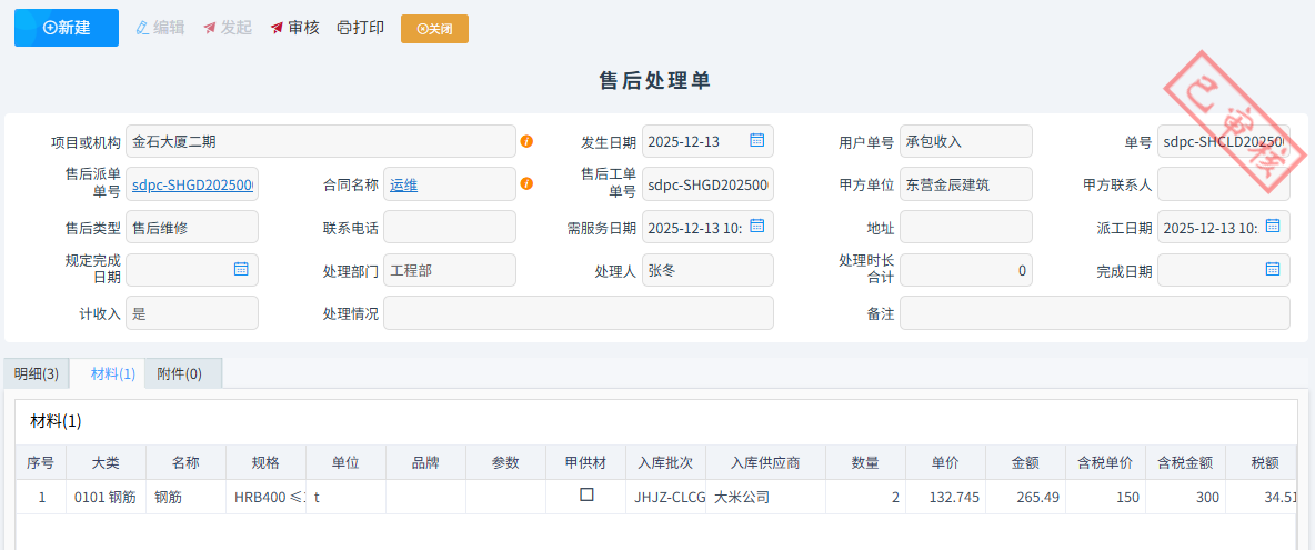 現(xiàn)場技術人員維修或者安裝完成之后填寫售后處理單。售后處理單可以關聯(lián)售后派單,自動生成需處理明細。