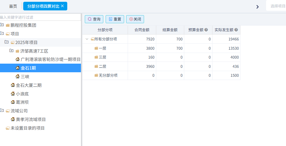 可以統計工料機預算與實際對比、合同清單與實際發生對比、分部分項四算對比