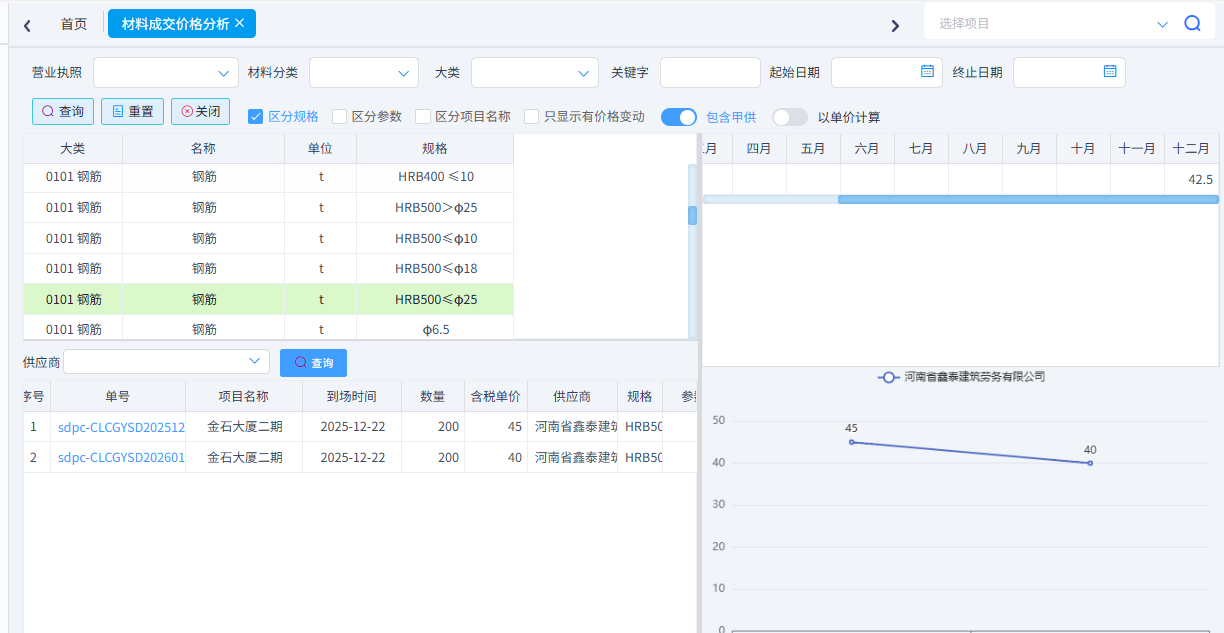 用于查詢所有類型的材料單據的內容明細。該功能可滿足關于材料明細的任何形式任何條件的查詢??梢园凑諉螕愋?、項目名稱、供應商、材料名稱、時間等條件進行篩選??梢詫С鯡xcel表格。