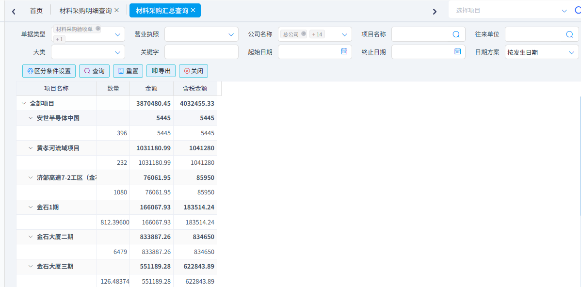 用于查詢公司或者項目材料采購和退貨情況,可以按照公司、項目名稱、供應商、材料名稱、發生日期等條件篩選。