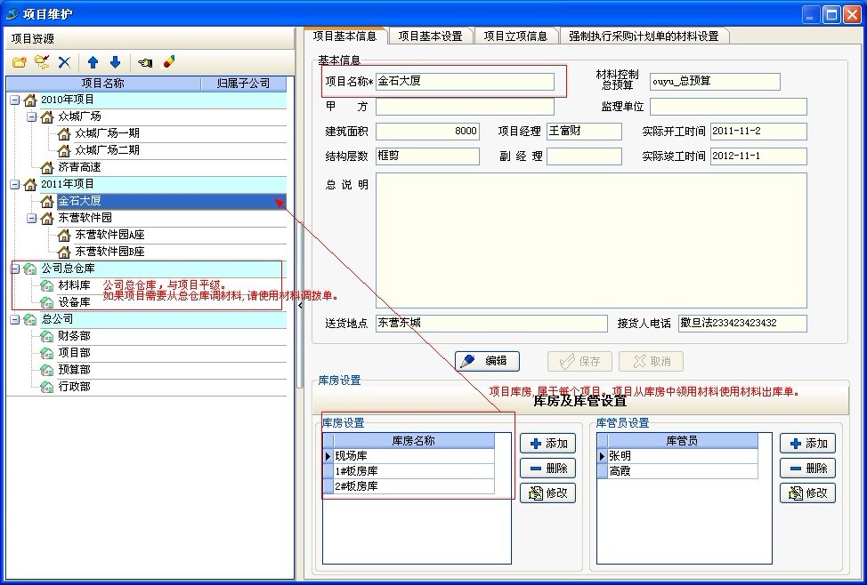 公司倉庫屬于總公司與項目是平級,項目庫房屬于項目(每個項目都可以設置自己的庫房)。設置方式如下圖: