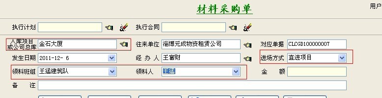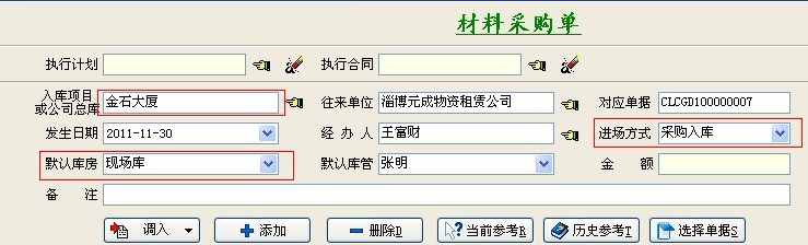 2、項目上報采購計劃 ->相關人員逐級審批通過->辦理采購->驗收入庫 (適合項目上大材批量采購,不需要簽訂供貨合同的)